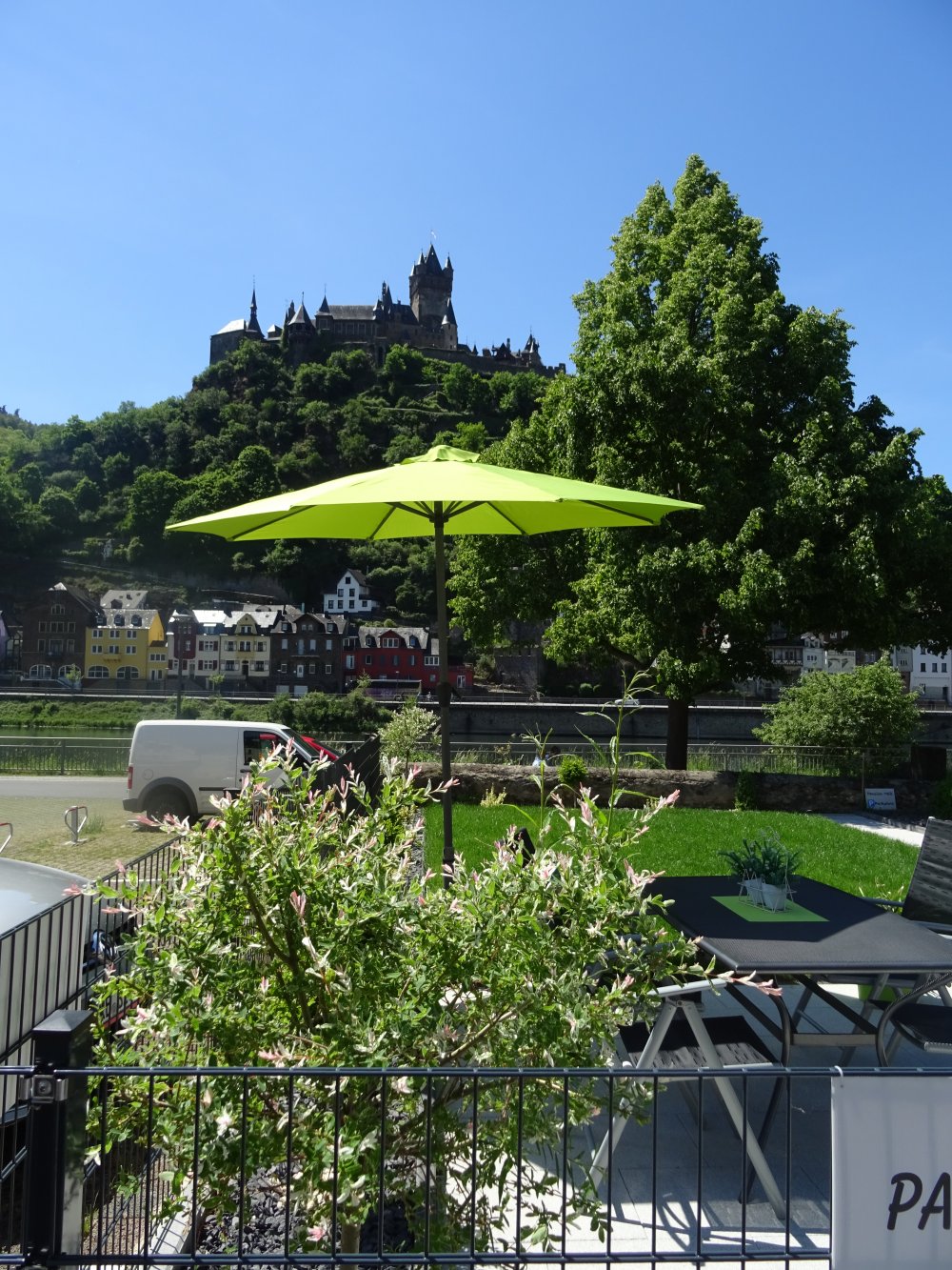 Der Garten mit Blick auf Mosel und Burg lädt zum gemütlichen Verweilen ein.