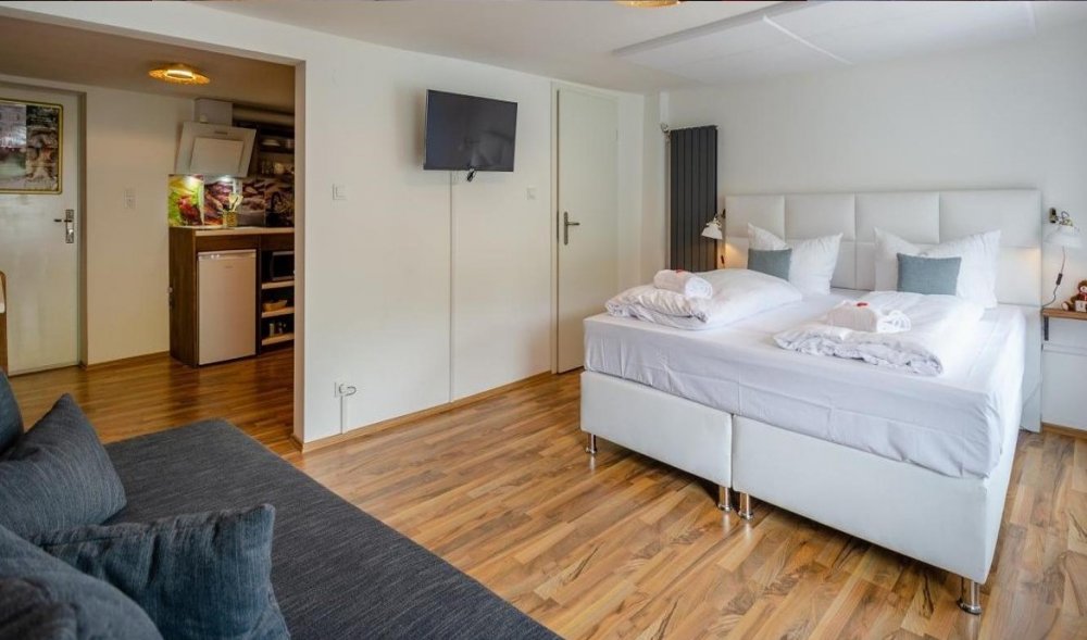 ENG: centrally located, own gastronomy, fully equipped studio apartments and rooms for 2-4 persons